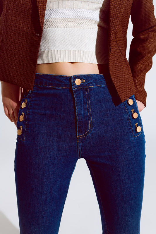 Skinny Flared Jeans in Dark Blue With Button Detail